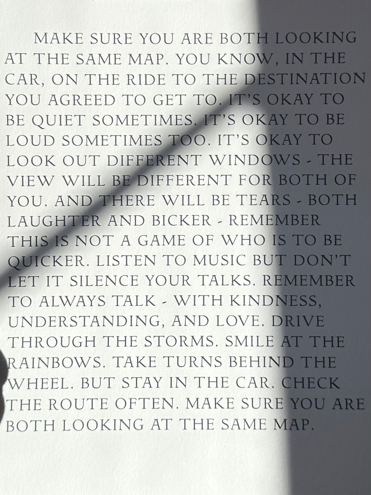 Make sure you are both looking at the same map. You know, in the car, on the ride to the destination you agreed to get to. It's okay to be quiet sometimes. It's ok to be loud sometimes too. It's ok to look out different windows - the view will be different for both of you. And there will be tears - both laughter and bicker - remember this is not a game of who is to be quicker. Listen to music but don't let it silence your talks. Remember to always talk - with kindness, understanding, and love. Drive through the storms. Smile at the rainbows. Take turns behind the wheel. But stay in the car. Check the route often. Make sure you are both looking at the same map.